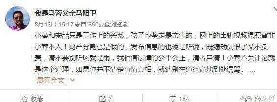 而馬蓉的父親馬陽衛也在事情爆發後,也曾發微博證實王寶強的子女都是親生的,而且還表示網上的出軌視頻[裸·照]等皆非馬蓉本人,請網友不要聽風就是雨,還表示相信法律的公平公正清者自清。